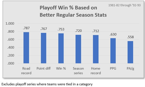 This was in bygone days, namely the period from the 1981-82 through 1992-93 seasons. At that time, squads with these advantages won more than three-quarters of their playoff series. Other categories also were solid, and a couple were less reliable, as the chart shows.