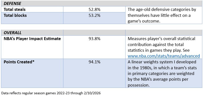 Decades ago, my research showed that an NBA team’s road record and point differential foretold a team’s strength or weakness better than its winning percentage. The difference was slight, but it meant that at the end of the regular season, teams with a better record away from home and/or a higher average margin of victory had the best chance of advancing in the playoffs.