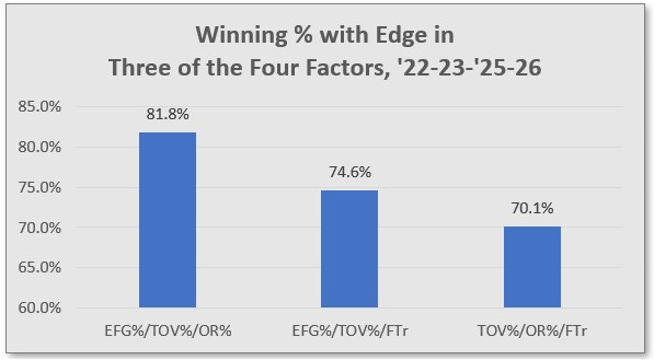 Looking at each category individually, a team with a higher EFG% percentage than its opponent wins 81.5% of the time – regardless of how they do in all other categories. If they have an OR% advantage, they win 56.0% of the time. Lower turnover percentage? 54.9%. Higher free throw rate? 54.7%.