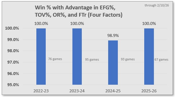 How powerful is this combination? It is overwhelming. Over the past four seasons, when a team outdoes its opponent in all four areas in the same regular season game, they win virtually every time. The win rate is 99.7%. In 332 applicable games, the Factors are 331-1, with an average margin of 20.5 ppg[2].