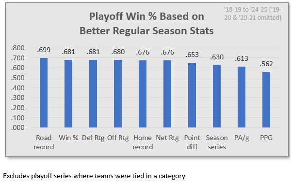 Still, over the past six NBA regular seasons[1], road record still ranks first. Clubs with a better record in games away from home have won 70% of playoff series. And point differential, ranked second decades ago, has fallen to fourth in importance among the same categories originally assessed.