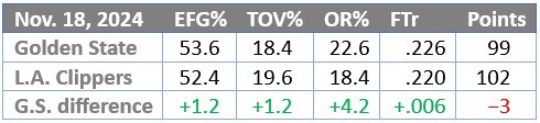 The exception to perfection – the only game in which the Factors did not hold up – was early in the 2024-25 season when the home-standing Clippers beat Golden State by three points, with the Warriors having a slight edge in all four categories. The Warriors only led for 1:16 in the contest, but they rallied from nine down in the final four minutes, losing only when Curry and Payton II both missed three-pointers, with 12 and two seconds left. But what really sunk Golden State was going 9-19 at the foul line[1]. The Four Factors data for the game: