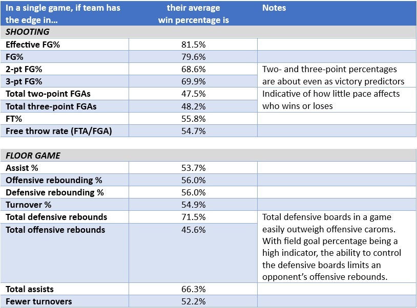 The subject of winning indicators has been explored in different ways over the years, notably by Dean Oliver. As you likely know, Dean is responsible for basketball’s Four Factors: the statistical areas most aligned with winning teams. His work showed that effective field goal percentage and rates of turnovers, offensive rebounds, and free throws combine to form a very strong indicator of NBA team strength.